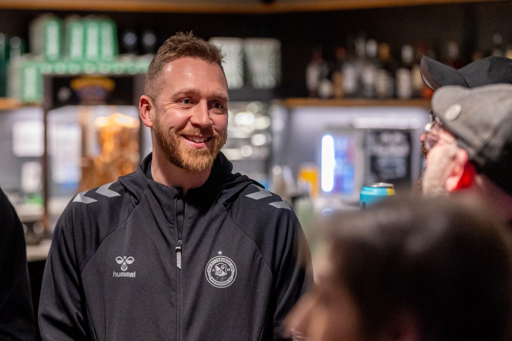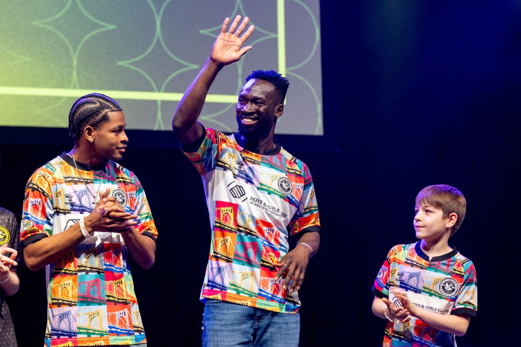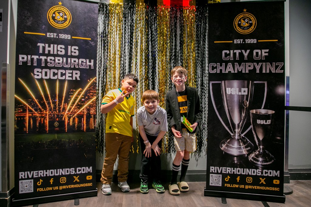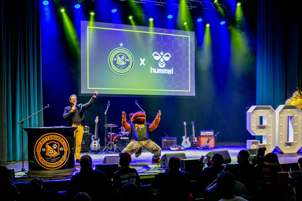 The team’s three 2026 kits — “The One,” “The Ninety,” and “The Chromatic” — all went on display for the first time Thursday night, as did the front-of-kit sponsors: returning partners Allegheny Health Network and 84 Lumber, and newcomer Boys & Girls Club of Western Pennsylvania. Speakers from the Hounds and partner organizations presented during the night, and Hounds players Danny Griffin, Albert Dikwa and Nico Campuzano modeled the new jerseys alongside family, a jersey contest winner and children representing the Boys & Girls Club.